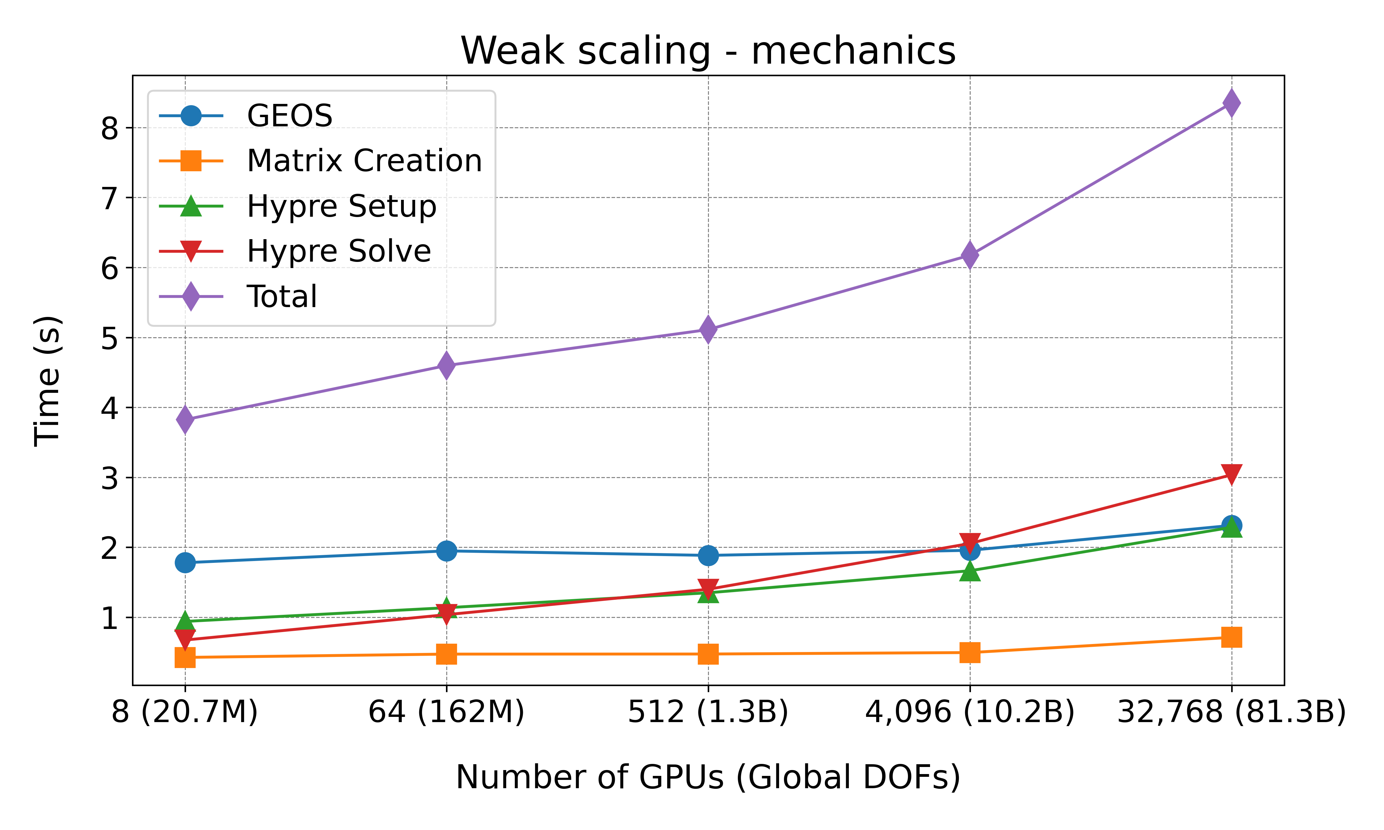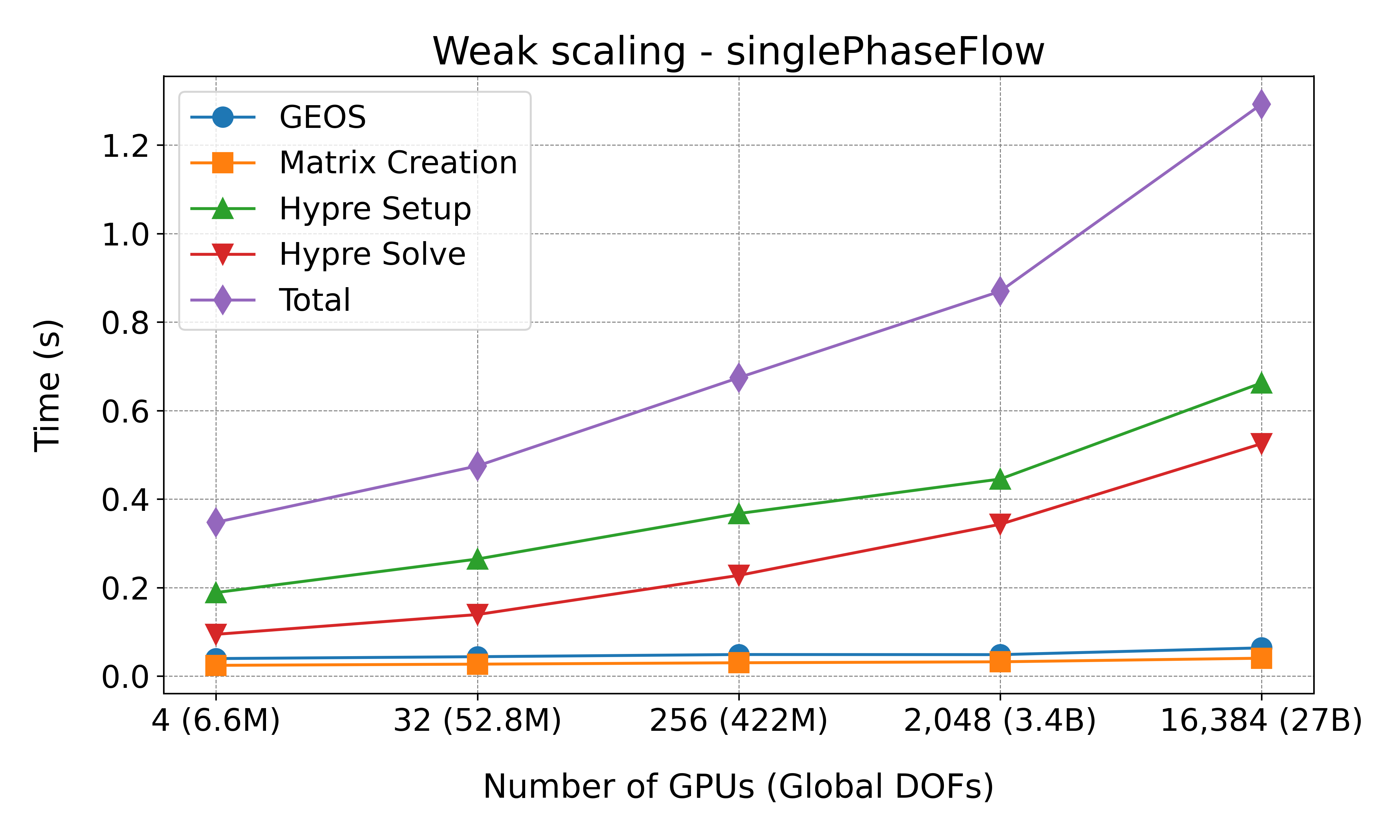 execution times per non-linear step for the following phases: GEOS, matrix creation, Hypre
