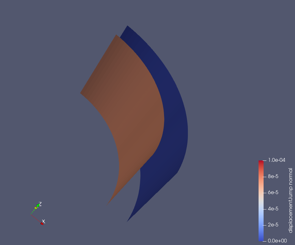 The GEOS results of displacement jump across the casing-cement and cement-rock interfaces are shown in the figure below: