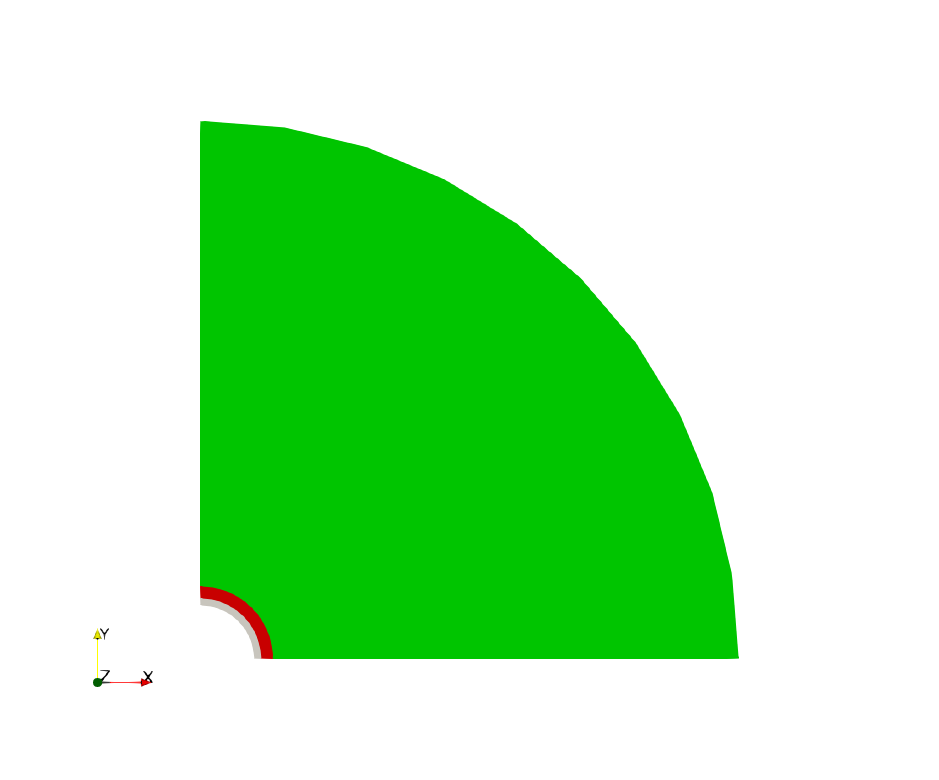The internal wellbore mesh generator InternalWellbore is employed to create the mesh of this wellbore problem. The radii of the casing cylinder, the cement sheath cylinder and the far-field boundary of the surrounding rock formation are defined by a vector radius. In the tangent direction, theta angle is specified from 0 to 90 degrees to simulate the problem on a quarter of the wellbore geometry. The problem is under plane strain condition and therefore we only consider radial thermal diffusion on a single horizontal layer. The trajectory of the well is defined by trajectory, which is vertical in this case. The autoSpaceRadialElems parameters allow for optimally increasing the element size from the wellbore to the far-field zone. In this example, the auto spacing option is only applied to the rock formation. The useCartesianOuterBoundary with a value 3 specified for the rock layer transforms the far-field boundary to a circular shape. The cellBlockNames and elementTypes define the regions and related element types associated to casing, cement sheath, and rock.