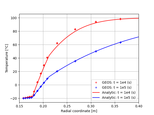 A good agreement between the GEOS results and analytical results for temperature distribution around the cased wellbore is shown in the figures below: