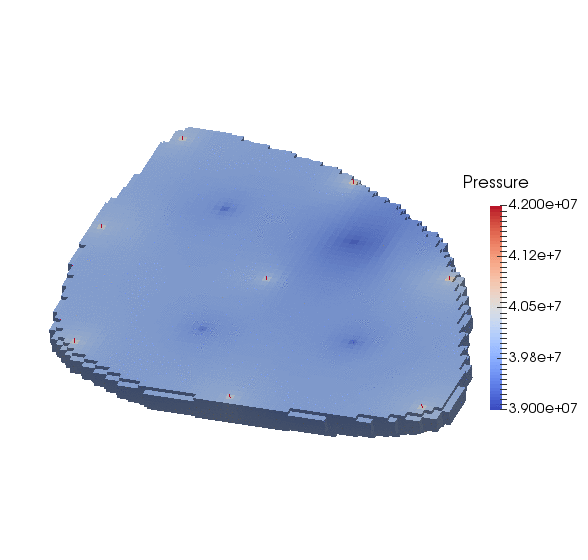 The reservoir mesh is imported from a .vtu file that contains the mesh geometry and also includes the permeability values in the x, y, and z directions. These quantities must be specified using the metric unit system, i.e., in meters for the well geometry and square meters for the permeability field. We note that the mesh file only contains active cells, so there is no keyword needed in the XML file to define them.