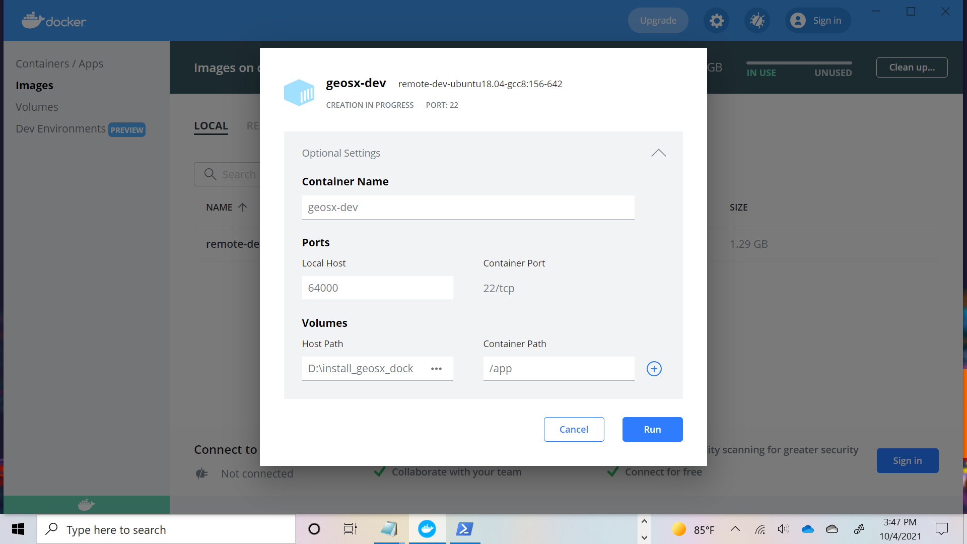 PS > docker run --cap-add=SYS_PTRACE  -d --name ${env:REMOTE_DEV_IMG}-${env:VERSION} -p 64000:22 --mount 'type=bind,source=D:/install_geosx_docker/,target=/app' ${env:REMOTE_DEV_IMG}:${env:VERSION}