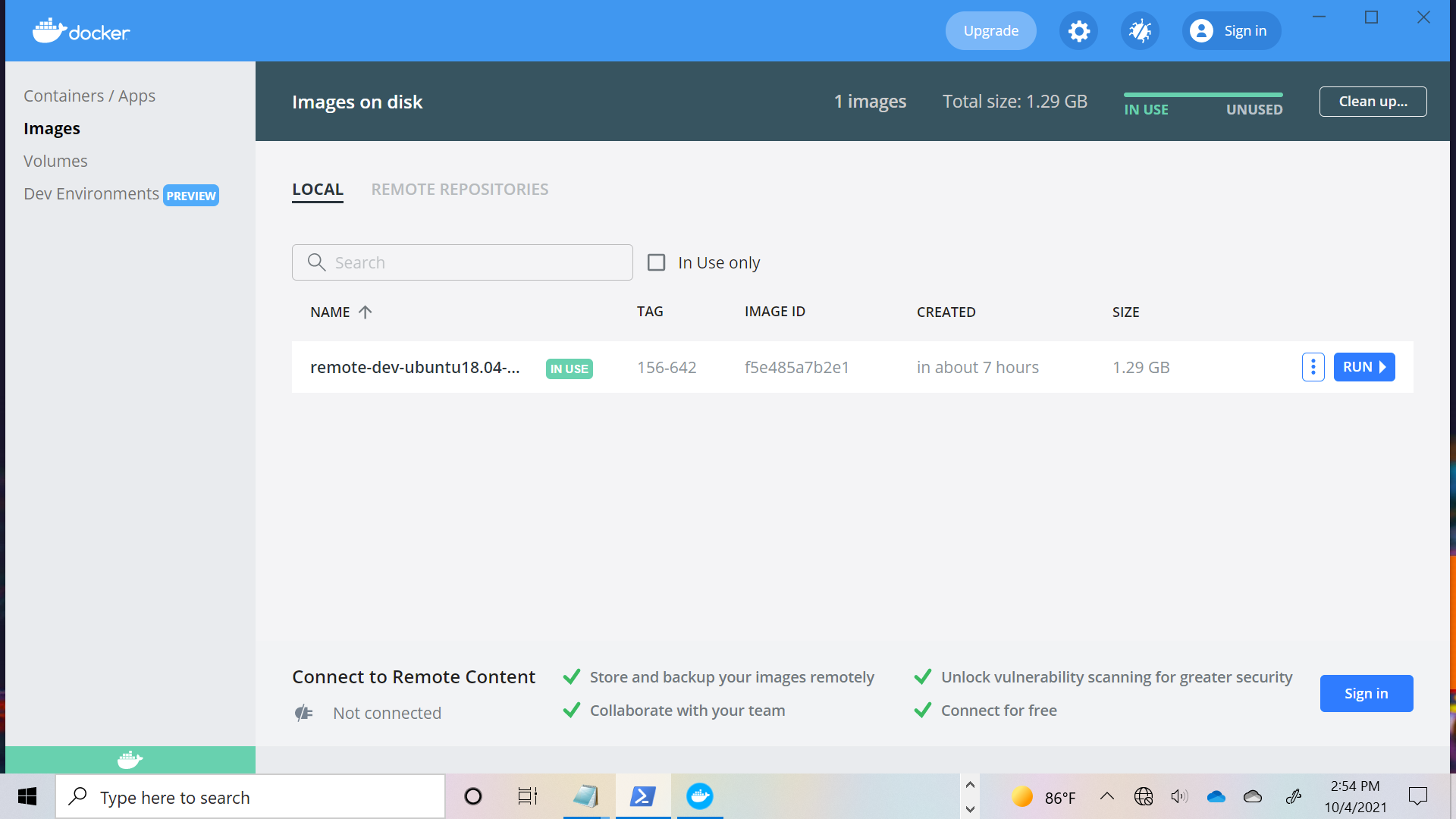 1efffac66c4c   remote-dev-ubuntu20.04-gcc9:224-965   "/usr/sbin/sshd -D"   Less than a second ago   Up 18 seconds   0.0.0.0:64000->22/tcp, :::64000->22/tcp   remote-dev-ubuntu20.04-gcc9-224-965