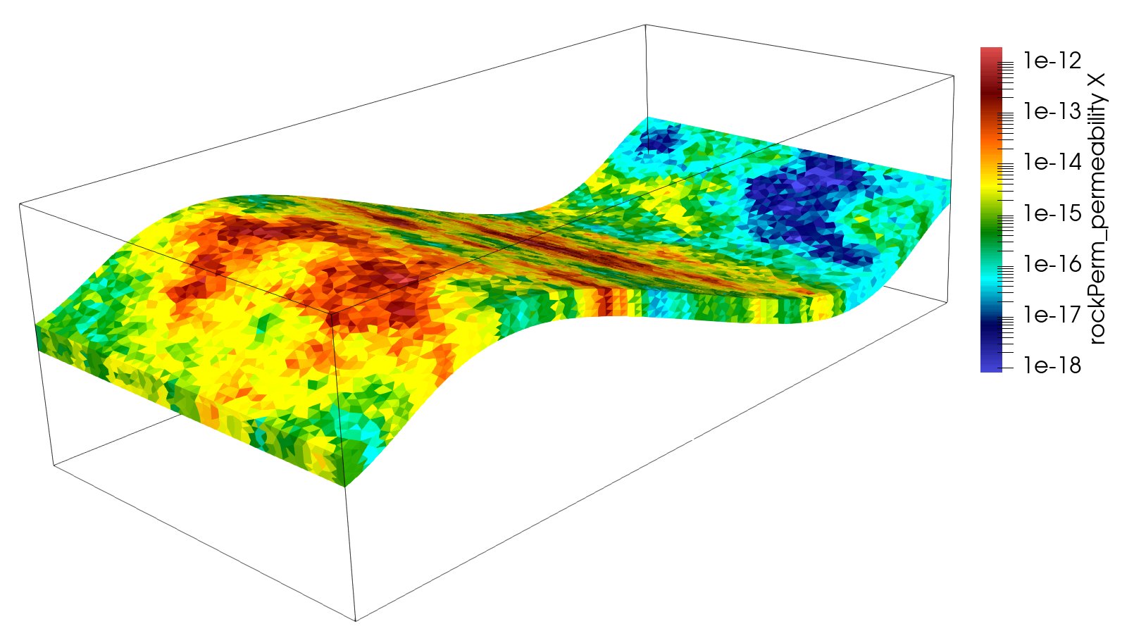 In this tutorial, we set up a simple field case for single-phase flow simulation (see Singlephase Flow Solver). We demonstrate how to run a basic flow simulation in the reservoir layer. We do not consider any coupling with wells. Injection and production will be specified by imposing a high pressure in the cells close to the injection area and a low pressure in the cells close to the production area.