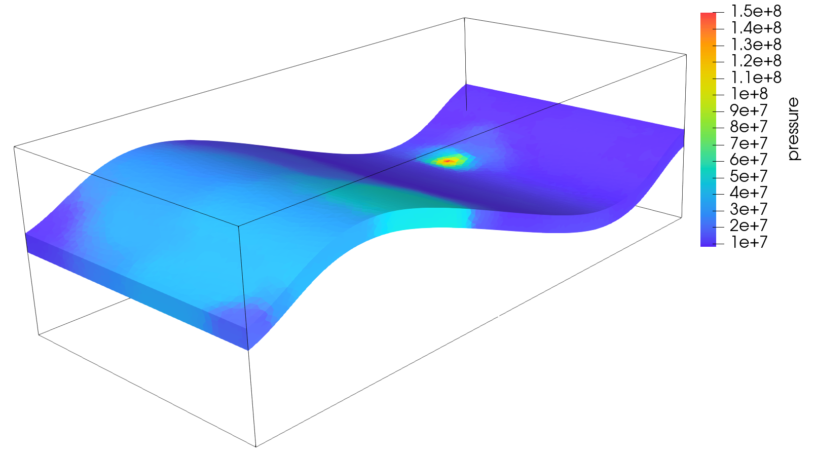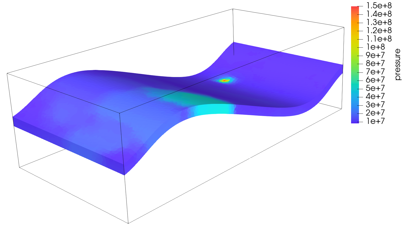 We can open the file syntheticReservoirVizFile.pvd with Paraview to visualize the simulation results. In the event block, we have asked for the output to be generated at regular intervals throughout the simulation, we can thus visualize the pressure distribution at different simulation times, showing the variation in the injection control.